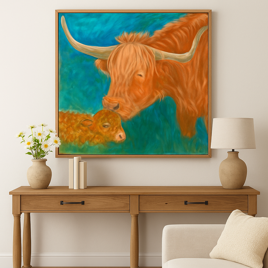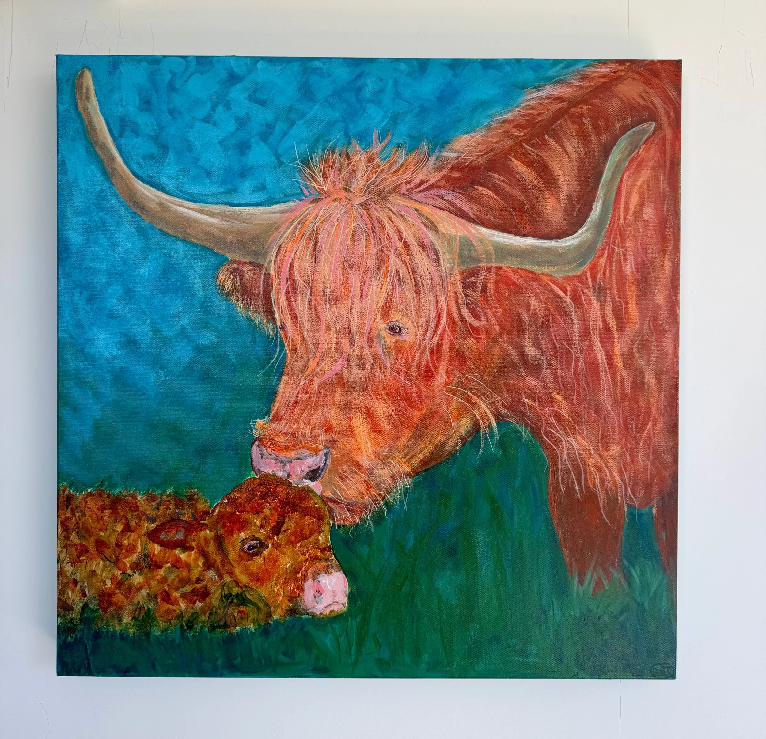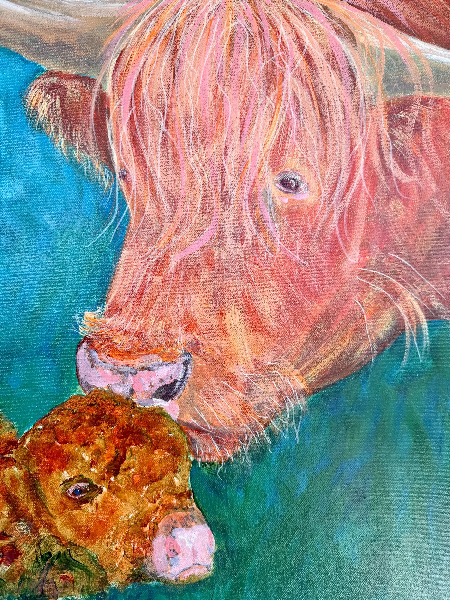This original acrylic painting captures the tender first moments between a Highland cow and her newborn calf- still damp from birth, greeted with warmth, instinct, and quiet devotion.