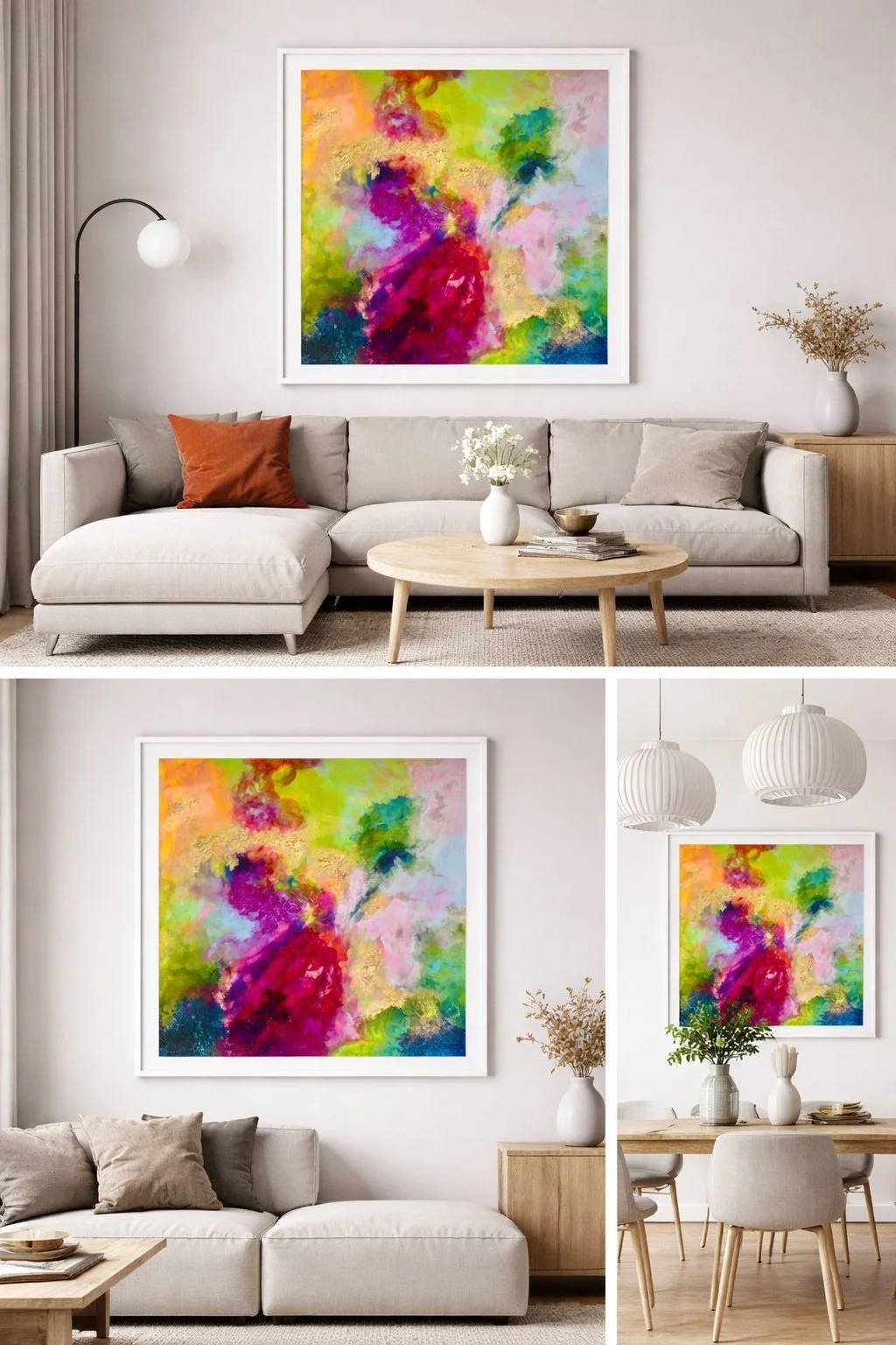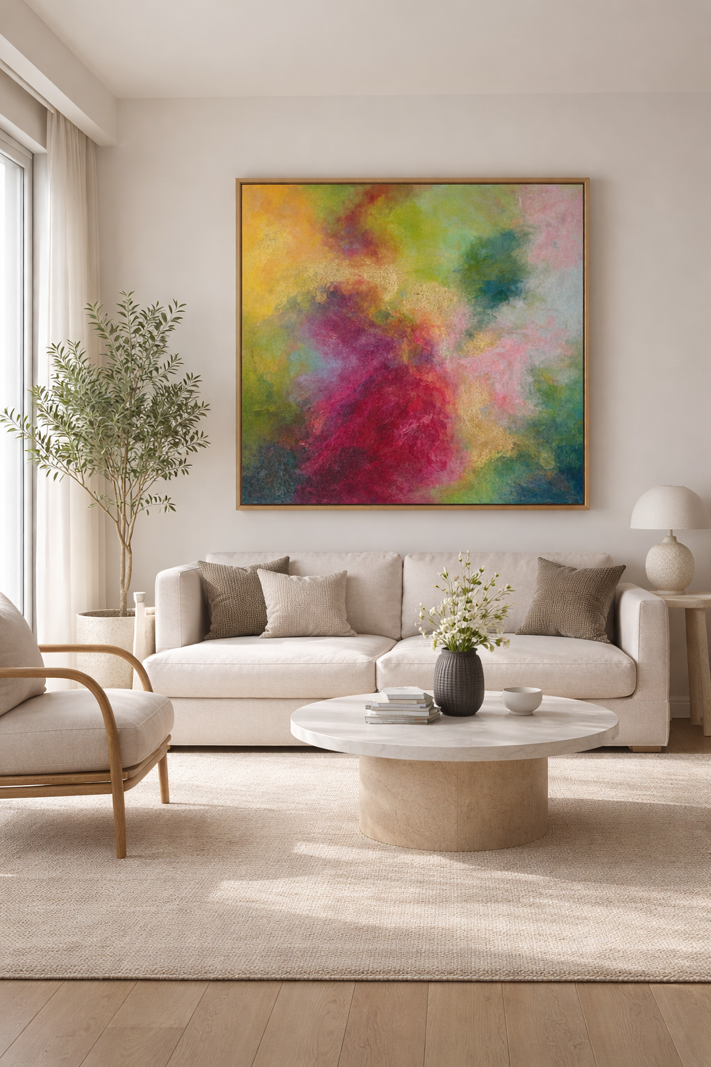 The piece invites a meditative gaze—calming, dreamlike, and expansive. Perfect for interiors needing a soft burst of color with emotional depth.