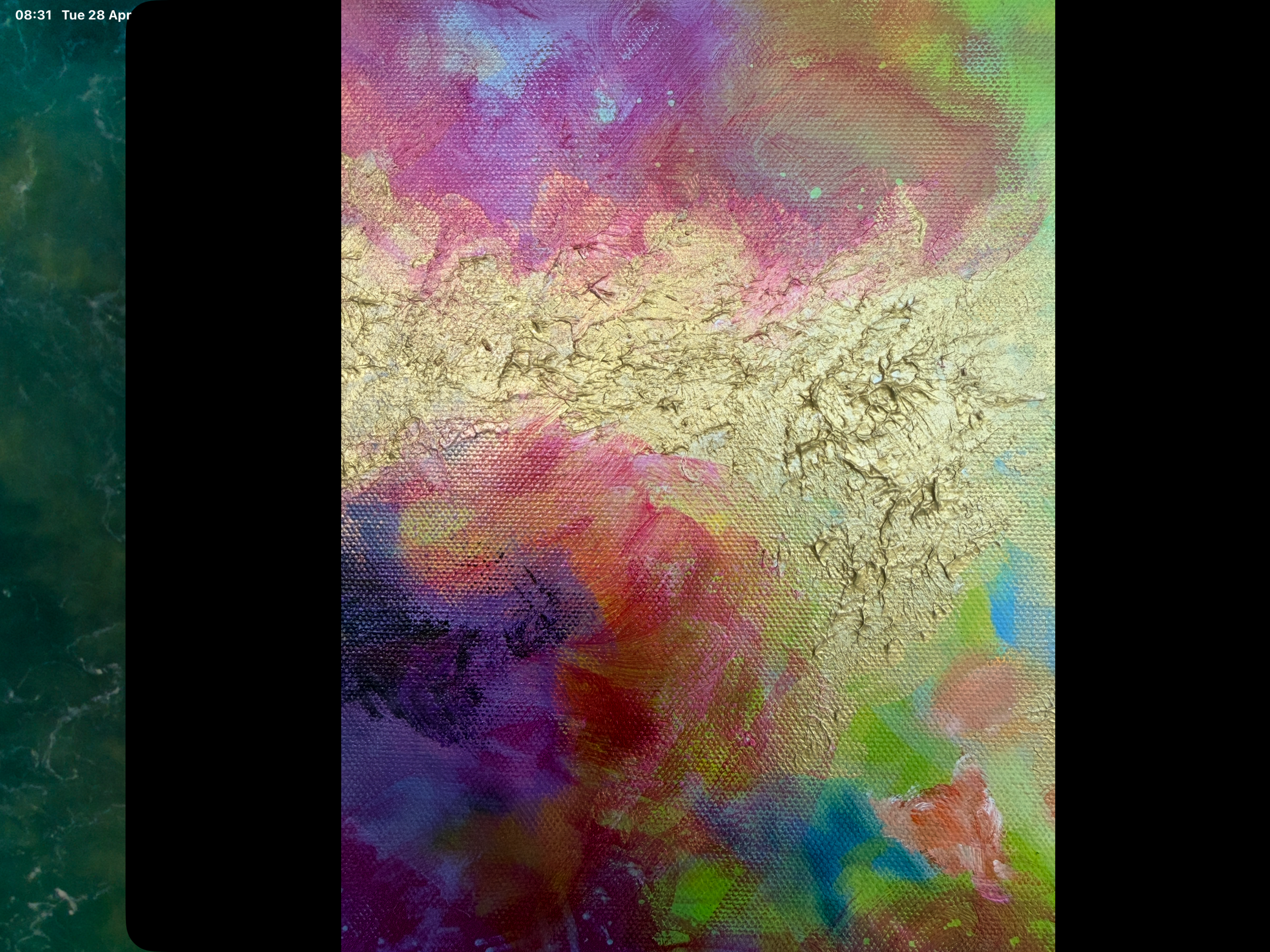 Whispers of Light is an ethereal abstract work that evokes the quiet magic of dawn or memory. Gentle transitions of pastel pinks, lemon-lime, soft teal, and dusky indigo seem to drift and dissolve into one another, giving the impression of light filtering through mist or foliage. Subtle diagonal rays offer a sense of movement, as though sunlight is breaking through an unseen canopy.