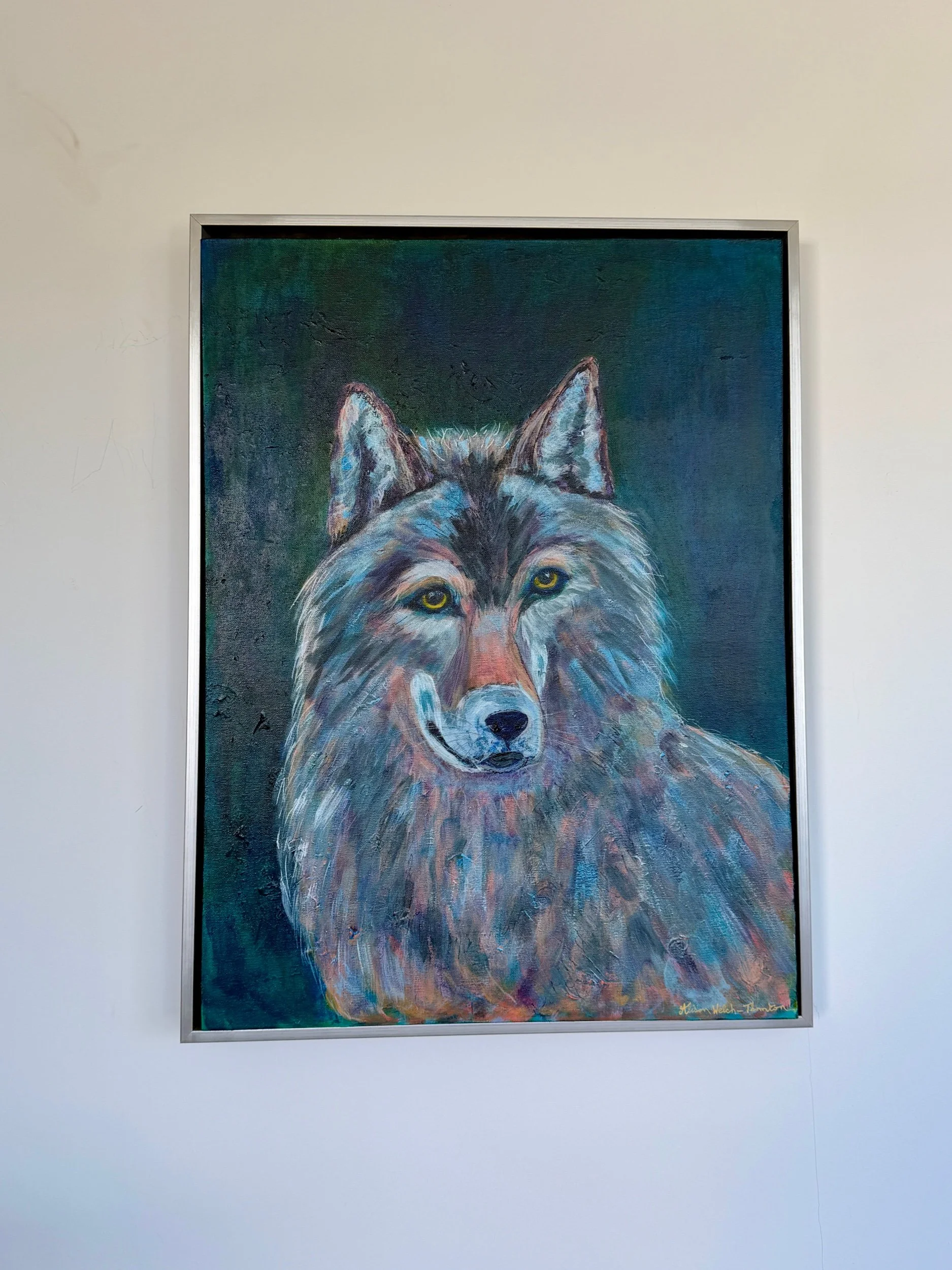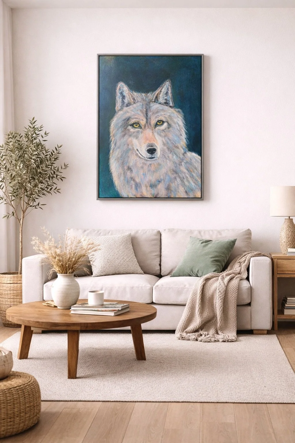 A quiet presence emerges from a dreamlike forest-this wolf, luminous with soft blues, violets and hints of rose, seems to catty the colours of twilight in its fur. Its golden eyes meet yours with a calm, knowing gaze, both wild and gentle, as it it guards a story older than the trees behind it.